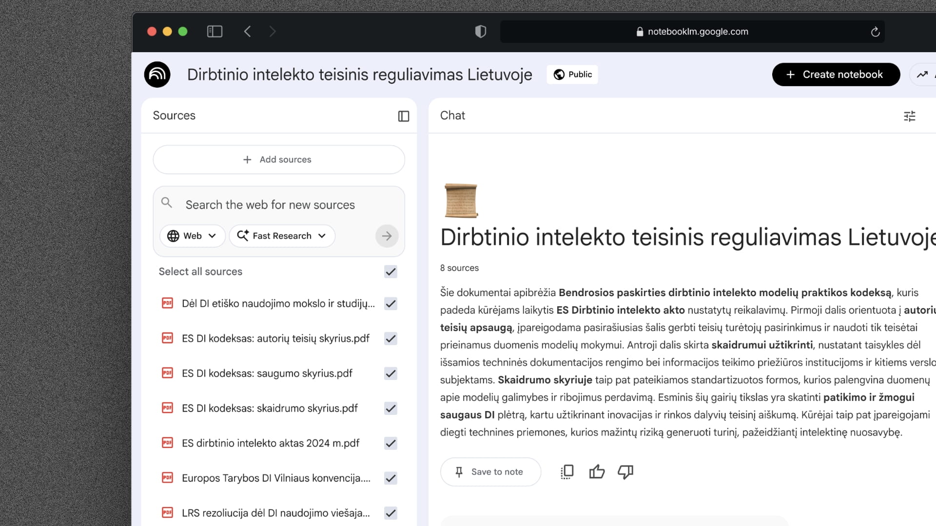 Čia rasite visus svarbiausius ES ir Lietuvos DI teisinio reguliavimo dokumentus. Galėsite juos išanalizuoti ir užduoti klausimus naudodami NotebookLM.